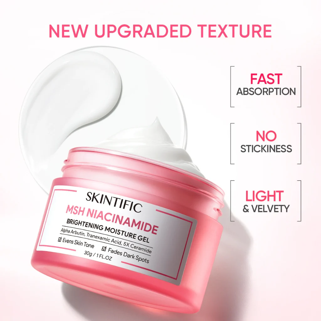 SKINTIFIC MSH Niacinamide Brightening Moisture Gel is a refreshing, lightweight moisturizer that delivers long-lasting hydration while targeting dullness, dark spots, and uneven skin tone. Enriched with a powerful blend of 5% Niacinamide, MSH Niacinamide Complex, and Tranexamic Acid, this gel cream works to brighten, minimize hyperpigmentation, and strengthen the skin barrier for a visibly radiant and even complexion. Its unique cooling gel texture absorbs quickly without clogging pores, making it ideal for all skin types, including oily and sensitive skin, especially in Pakistan’s hot and humid climate.